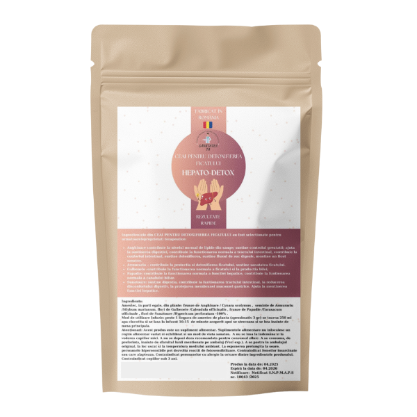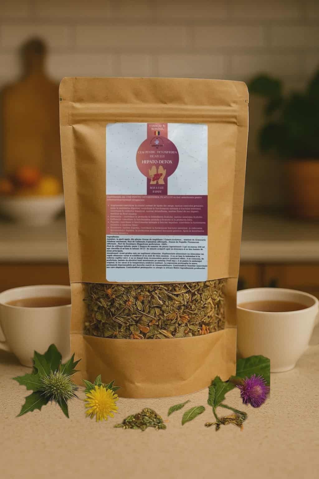 Hepato Detox este un ceai 100% natural, produs în România, conceput pentru a sprijini funcția normală a ficatului și procesele naturale de detoxifiere.